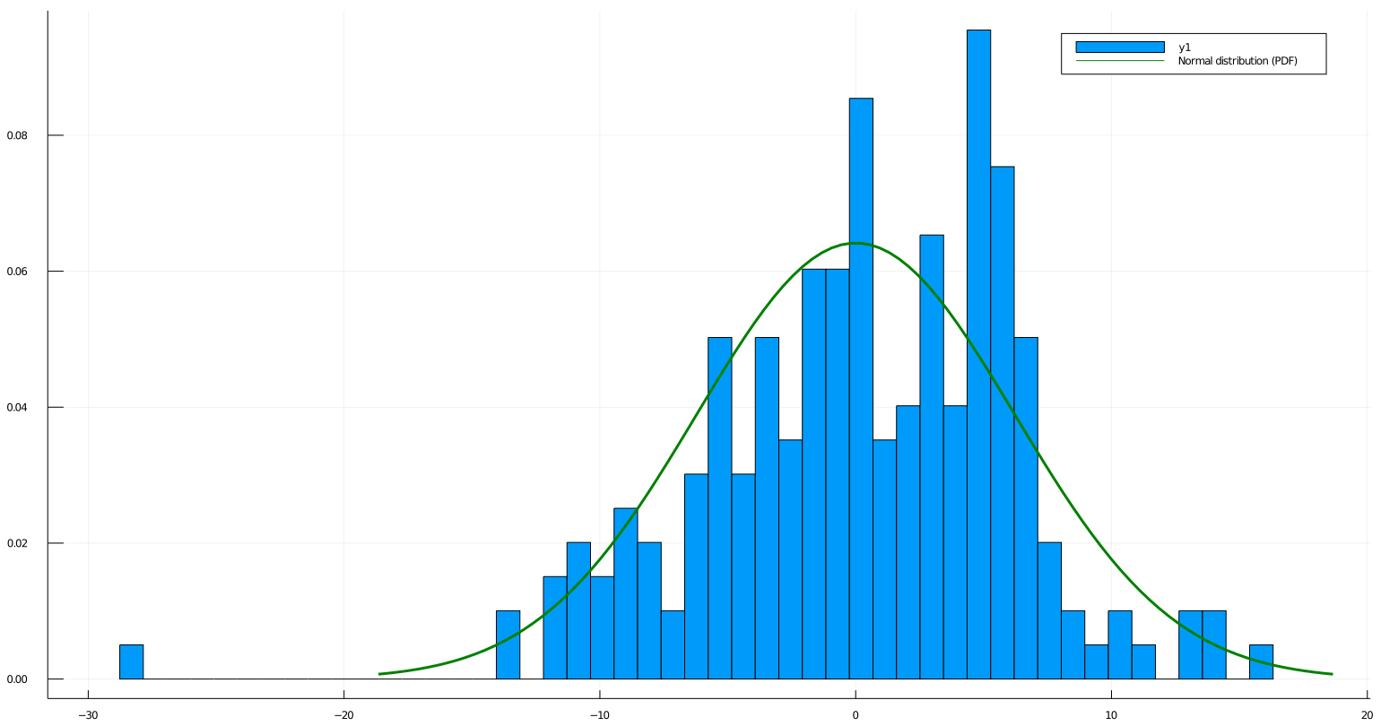 We just have to center our observations around\(0\)and then stretch it by a factor of\(\sqrt{n}\).mean_ = mean(sqrt(n) .* (sample_means .- mean(distribution))) std_ = sqrt(n) * std(sample_means) # Centered and stretched sample mean (r.v.) sample_means = sqrt(n) .* (sample_means .- mean(distribution)) # Getting Histogram num_bins = 50 bins = Array(LinRange(minimum(sample_means), maximum(sample_means), num_bins)) h = fit(Histogram, sample_means, bins) counts = h.weights Plots.histogram(sample_means, bins=bins, weights=(1/sum(counts)).*ones(length(sample_means))) # Getting PDF N(0, σ) x = LinRange(-3*std_, 3*std_, 100) pdf_ = pdf.(Normal(0, std_), x) plot!(x, pdf_, c="green", label="Normal distribution (PDF)", lw=3)Now the plot feels much more Normal but here the random variable is