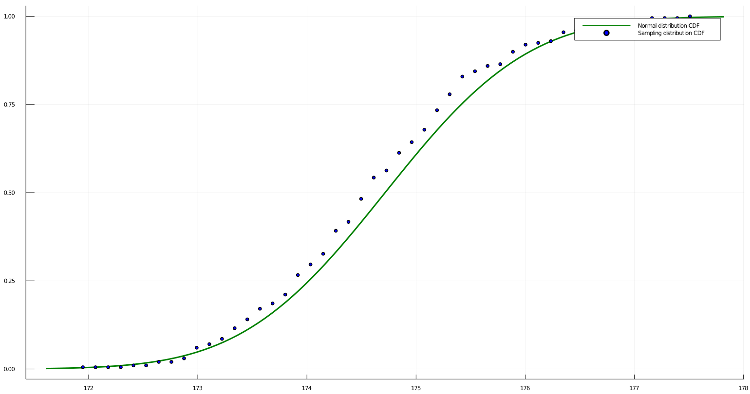 scatter!(bins, cdf_, color="blue", label="Sampling distribution CDF")