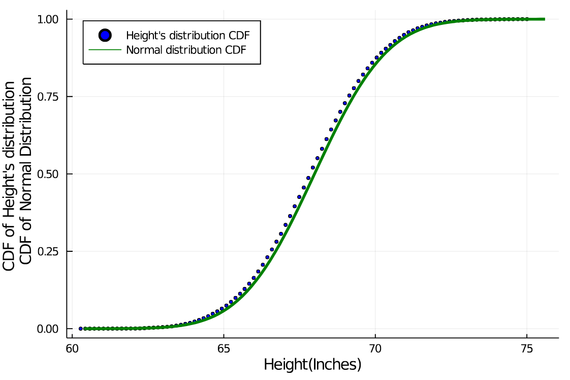 Plots.ylabel!("CDF of Height's distribution \n CDF of Normal Distribution")